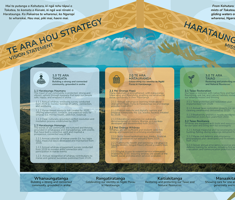 Harataunga (Kennedy Bay) is a remote coastal community in the Coromandel with deep whakapapa ties to Ngāti Porou through tuku whenua (gifting of land). A community wānanga was held at Harataunga Marae to begin shaping a 100-year strategy for Harataunga – a long-term vision grounded in whakapapa, whenua, and the aspirations of whānau across generations. The process brought together the descendants to reflect on their past, dream for their mokopuna, and identify Pou to guide the collective journey ahead.